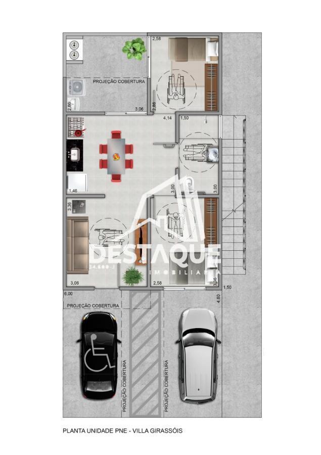 Com 90,32 m² de área total e 63,61 m² de área privativa, a casa oferece o equilíbrio ideal entre conforto e praticidade.